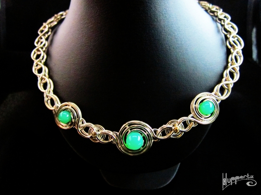 Dieses handgefertigte Collier aus 925er Silber mit Chryopasen und gelben Saphiren ist ein extravaganter Blickfang zu edler Abendgarderobe. Es kann durch das passende Set, welches auch bei uns erhältlich ist, ergänzt werden.